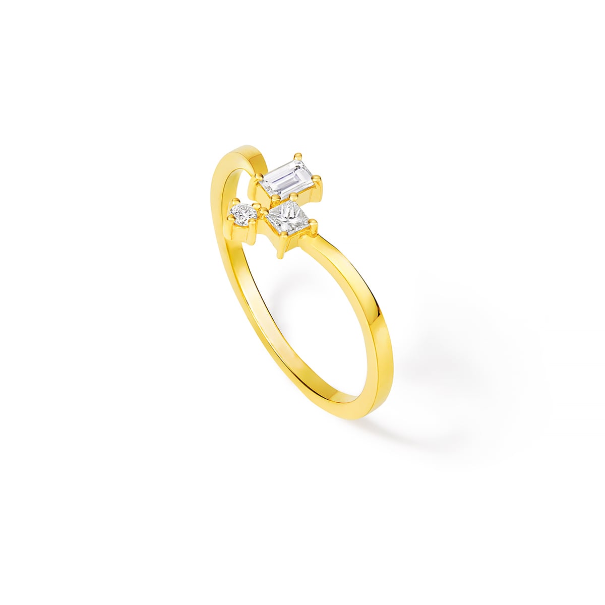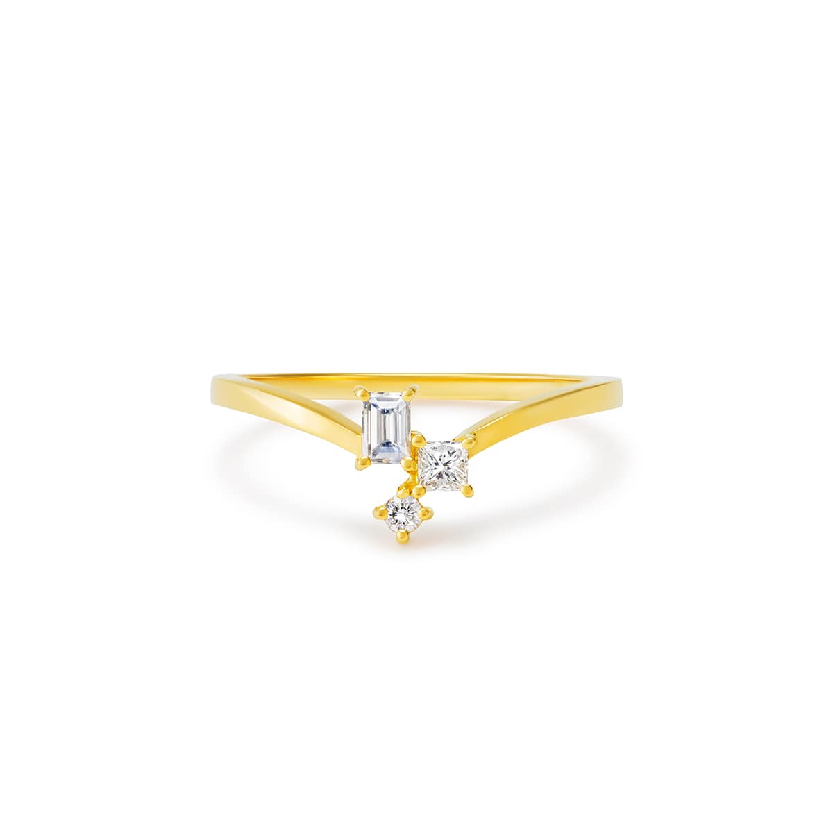 A necklace inspired by the elegant shimmer illuminated by the sun's rays. The shimmer of diamonds and the luster of yellow gold express "movement" and "softness" of light.The three different cut diamonds - the baguette cut, the princess cut and the round brilliant cut - harmoniously blend together and bring a luxurious and rich expression to the hand.Furthermore, the design that features diamonds meticulously set along a delicate V-shaped line, gracefully accentuates the beauty of the fingers.Material:18K yellow gold / diamondsProduct Number:n-a-91Collection:mosaicCarat:diamond approx. 0.13 caratSize:#5 - #15 / top approx. 7.0mm (L) ×5.1mm (W) / ring width approx. 1.3mm