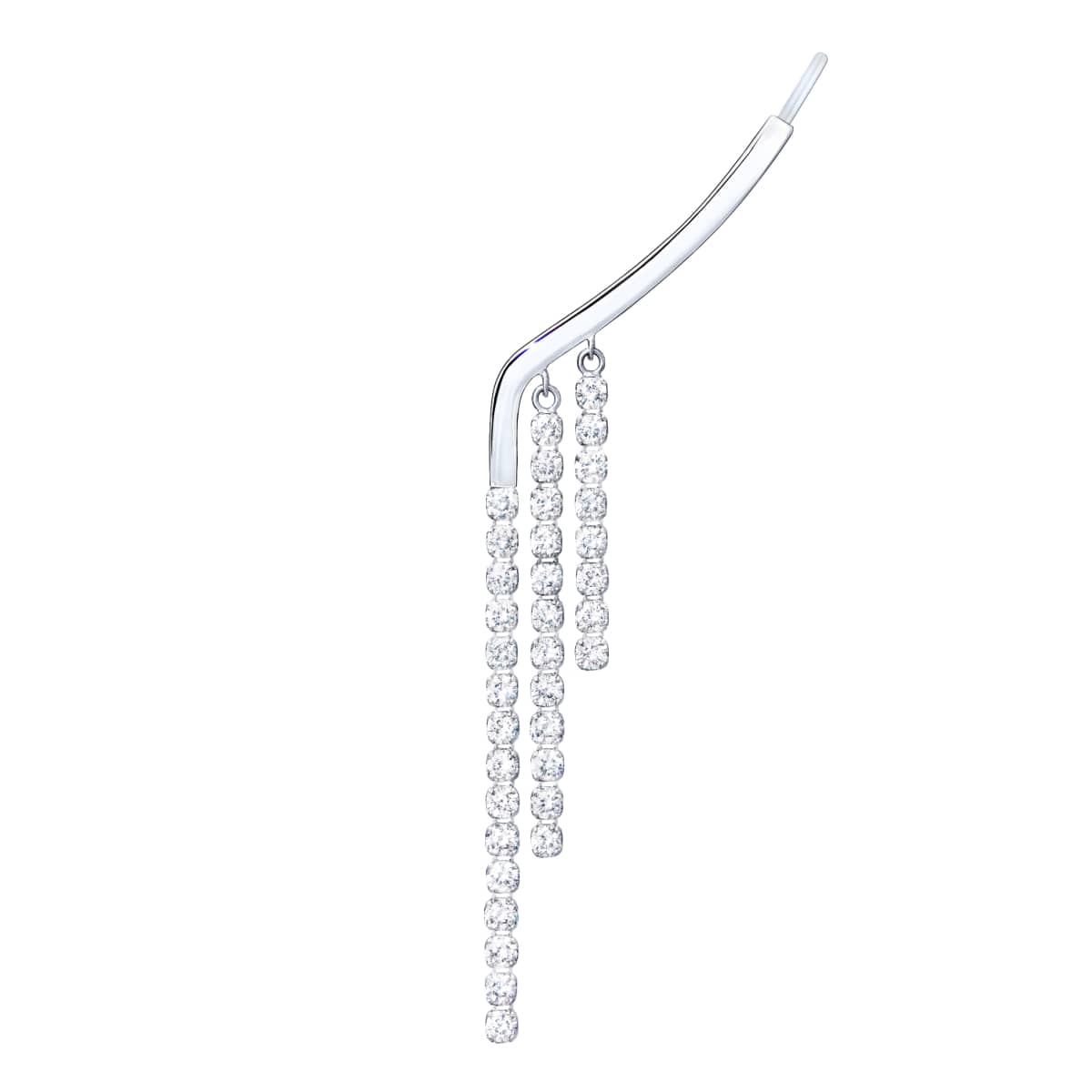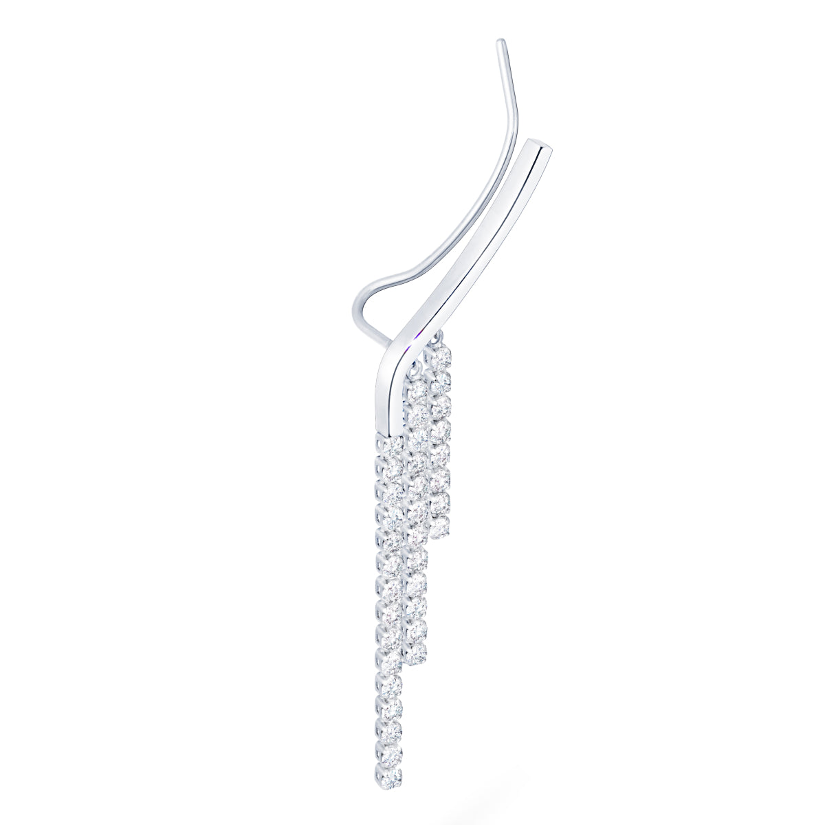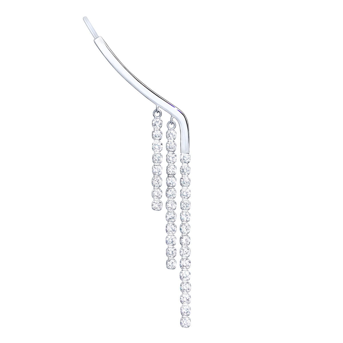 耳たぶに沿うようにカーブしたオーガニックなラインと、その延長線上にセッティングされたダイヤモンドのテニスチェーンが、動くたびに軽やかな躍動感を放ちます。しなやかにスイングするダイヤモンドのフリンジが横顔に遊び心を添える、ファッショナブルなジュエリーです。