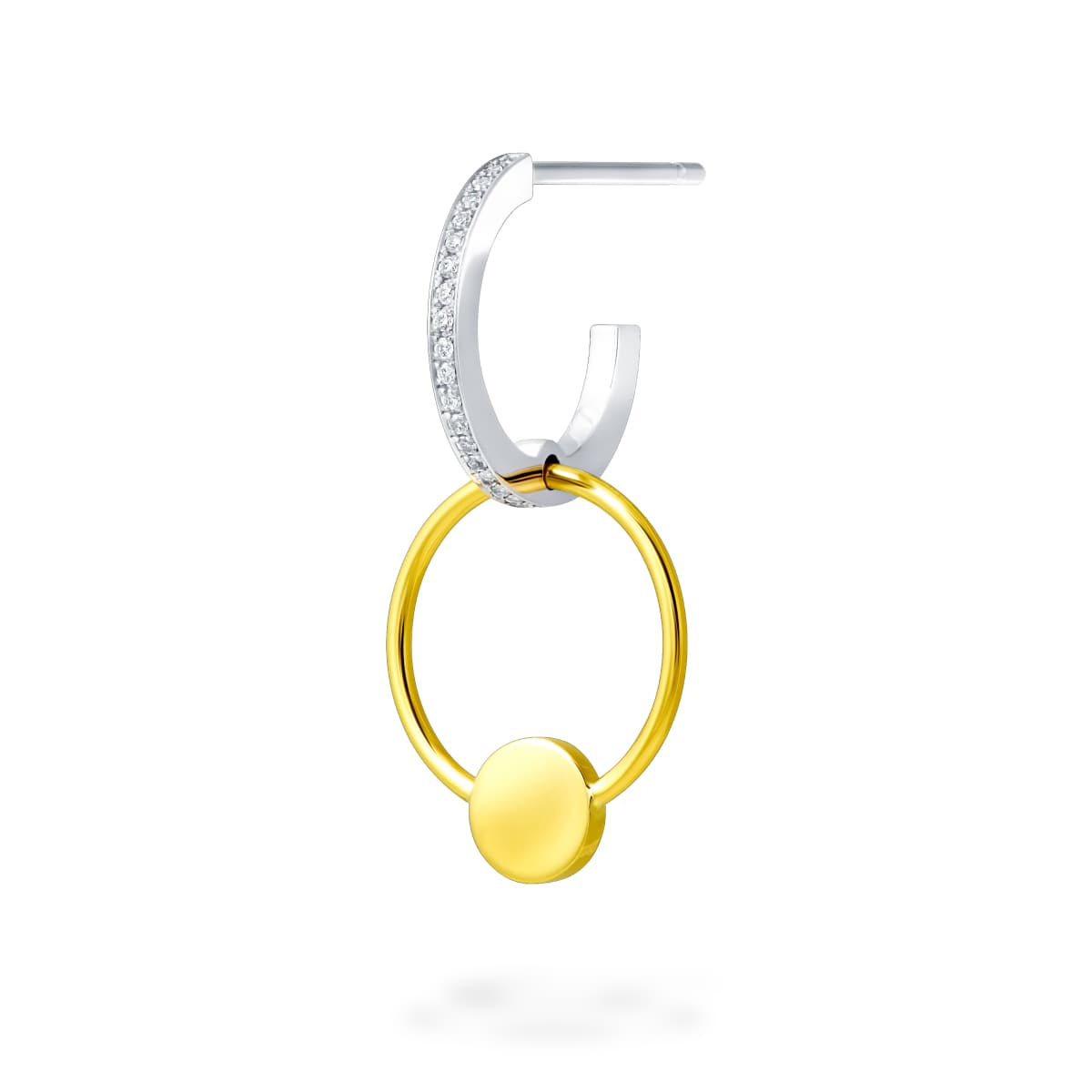 This single earring draws your attention with the combination of glistening 18 karat yellow gold plate and diamond-embellished platinum line. The mix of different materials brings out the beauty of each.