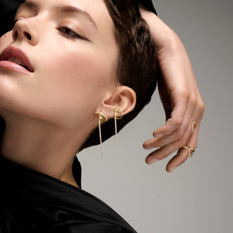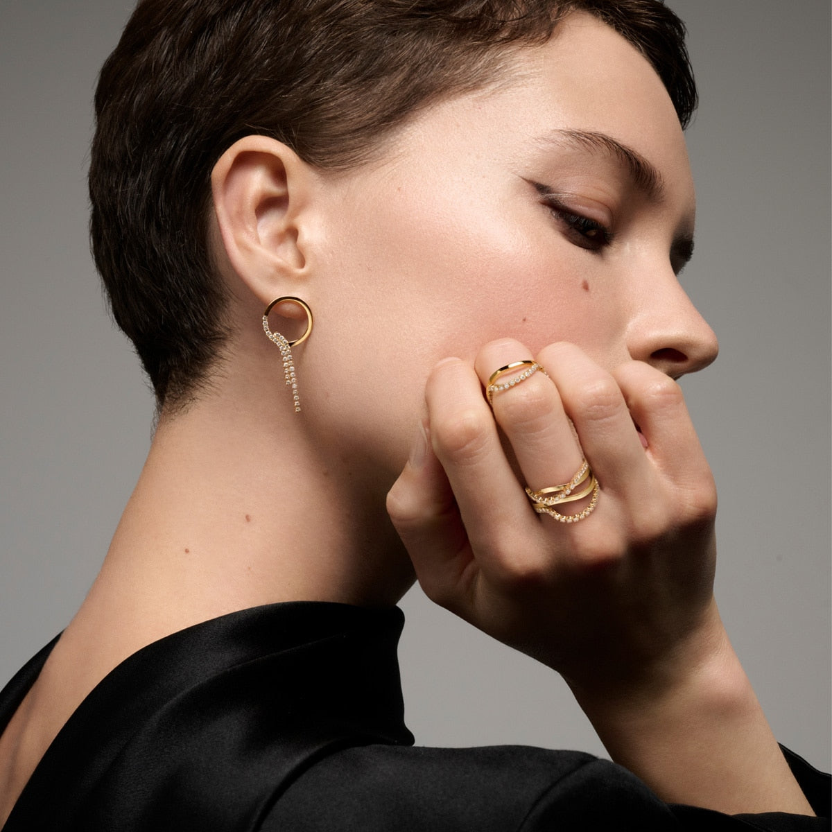 This series is inspired by chandeliers radiating a sophisticated brilliance and adding glamor to a space with beautiful light and shadows. The flowing diamonds sway gently along the skin, emitting a radiant sparkle.