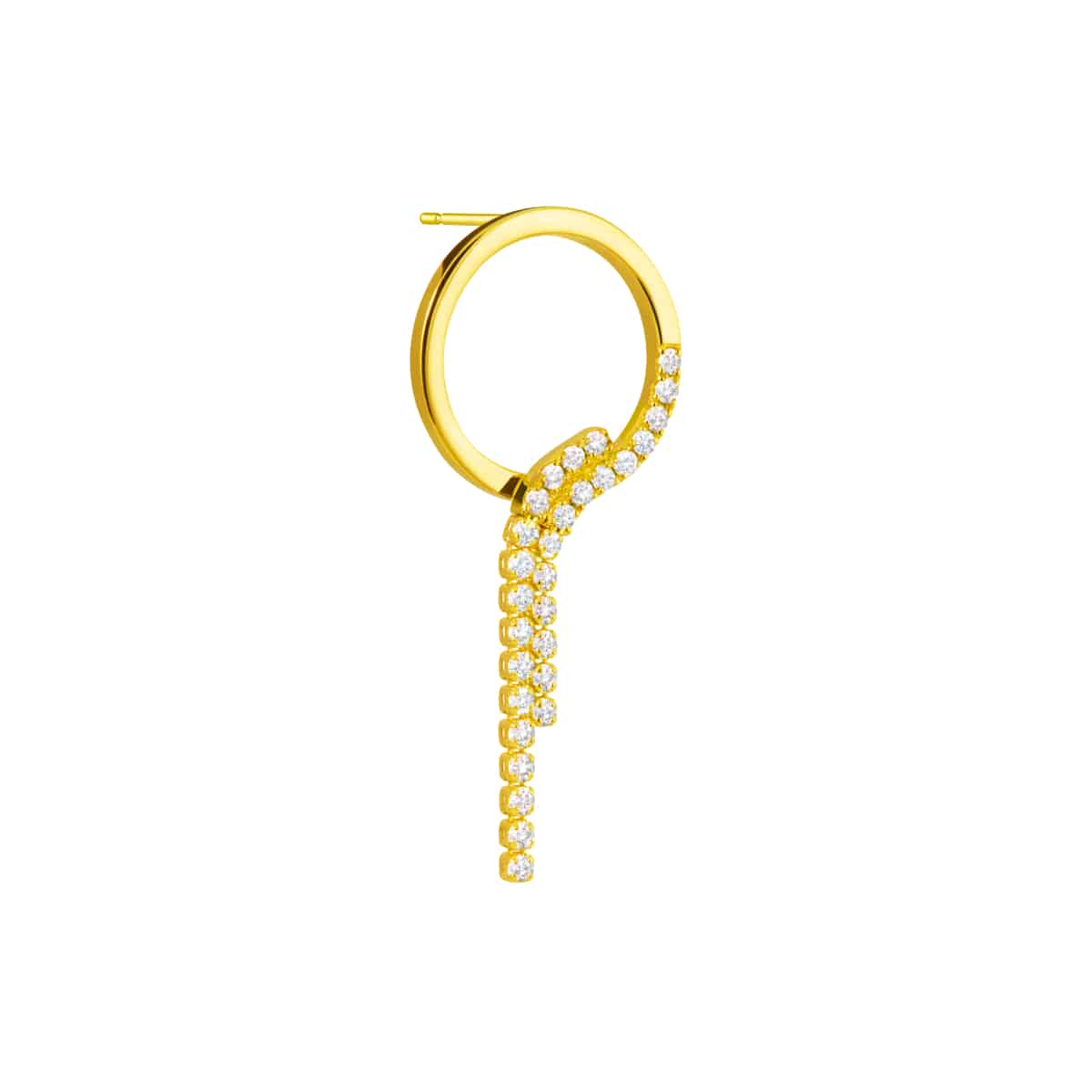 A lustrous single earring designed to evoke the image of diamonds cascading from a circle of yellow gold.