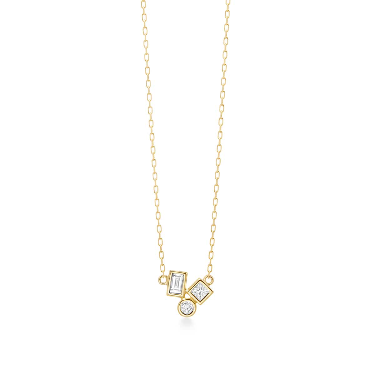 英語で「融合」を意味する“fusion ”(フュージョン)の名の通り、ラウンドカット、バゲットカット、プリンセスカットのダイヤモンドを絶妙なバランスでセッティングしたネックレス。