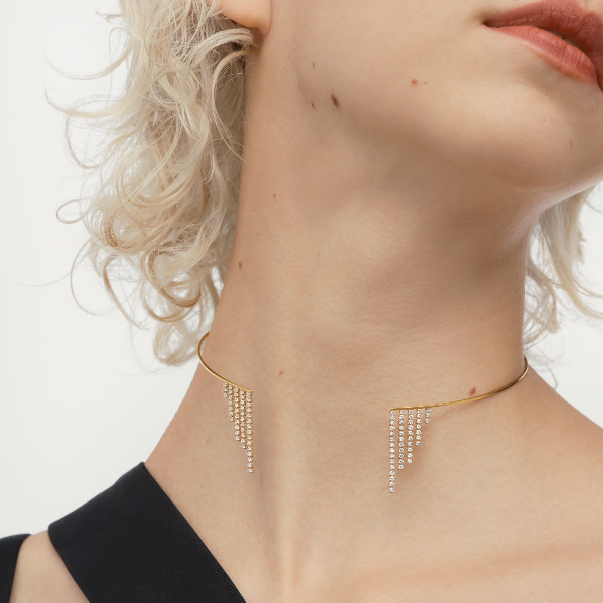 18K黃金頸錬鑲嵌1.1克拉鑽石,營造出前衛十足的設計感。